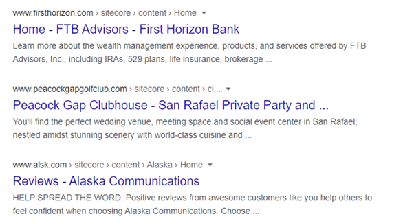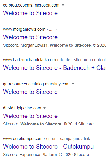 Try this in google:[site:*.com "Welcome to Sitecore"](https://www.google.com/search?q=site%3A*.com+%22Welcome+to+Sitecore%22) or [site:*.com "From a single connected platform that also integrates with other customer-facing platforms"](https://www.google.com/search?q=site%3A*.com+%22From+a+single+connected+platform+that+also+integrates+with+other+customer-facing+platforms%22)