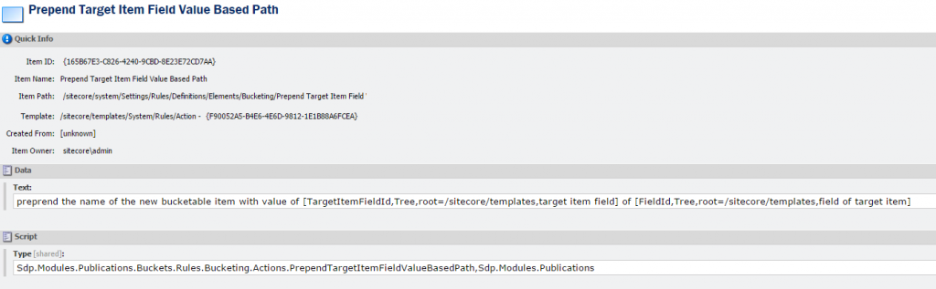 It would be more efficient if we create generic actions to make this Bucket Folder Path possible. Like we mentioned earlier we needed the value of a field of a referenced item and we needed the value of a DateField from the Bucketable item. We can do this with two separate actions that work based on prepending.