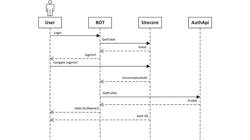 Authentication with the Bot happens when the user asks for something that needs the user to be authenticated with Sitecore. The following diagram shows the flow of the conversation when the user greets the bot in an authenticated situation and an anonymous situation.
