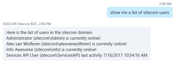 Managing Sitecore users normally requires you to log into Sitecore, navigate to the User Manager and lookup the specific user. This could also be done with the bot.