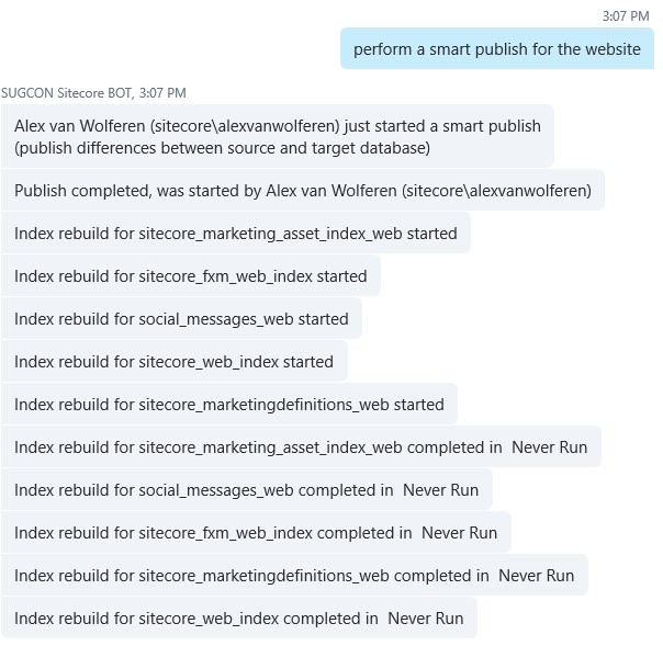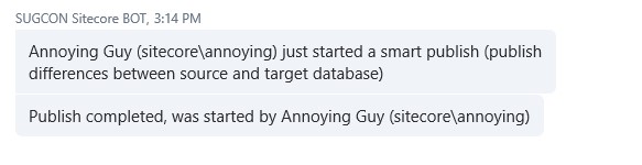 I’ve implemented several intents for publishing activities. If you would like to perform a publish and get notified on publish events of others you can use the Bot. The notifications work the same as the notifications for the indexing events.